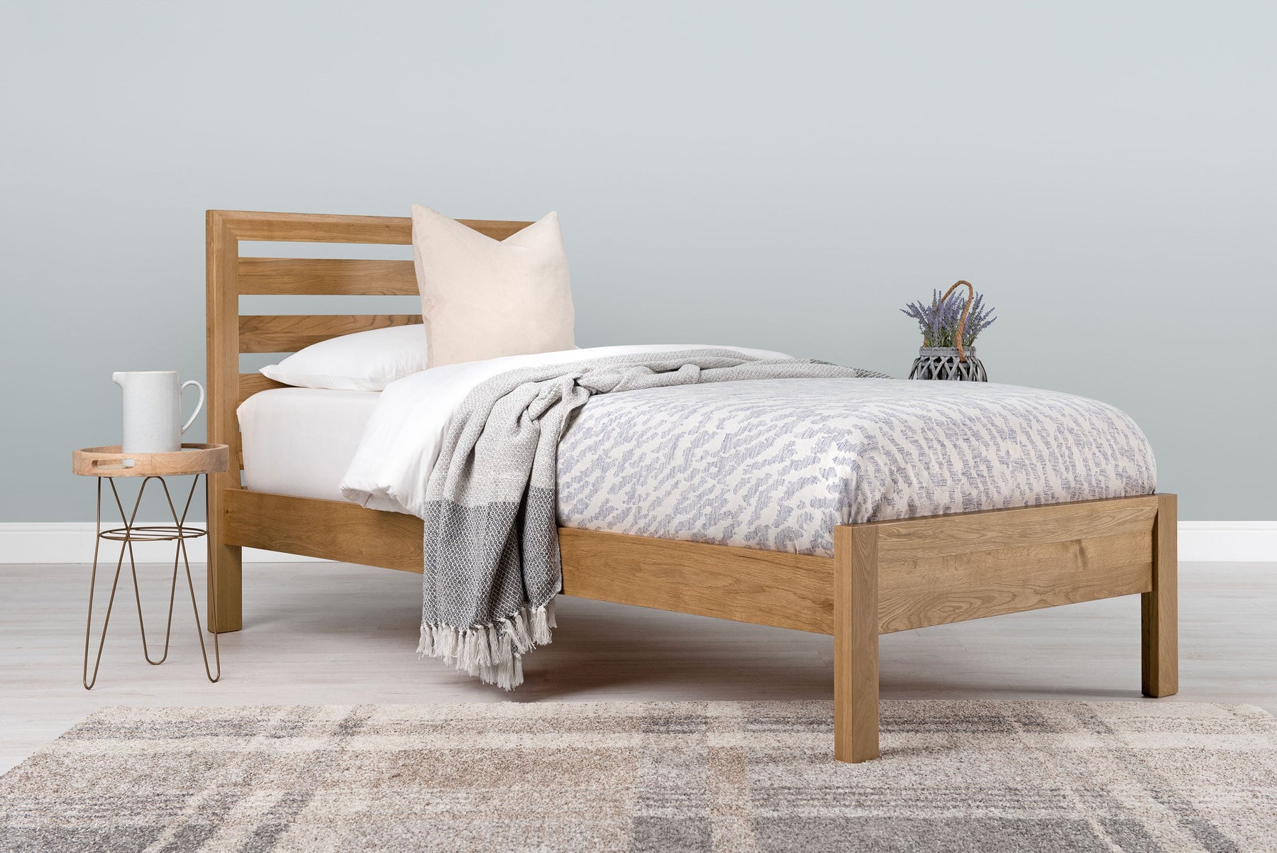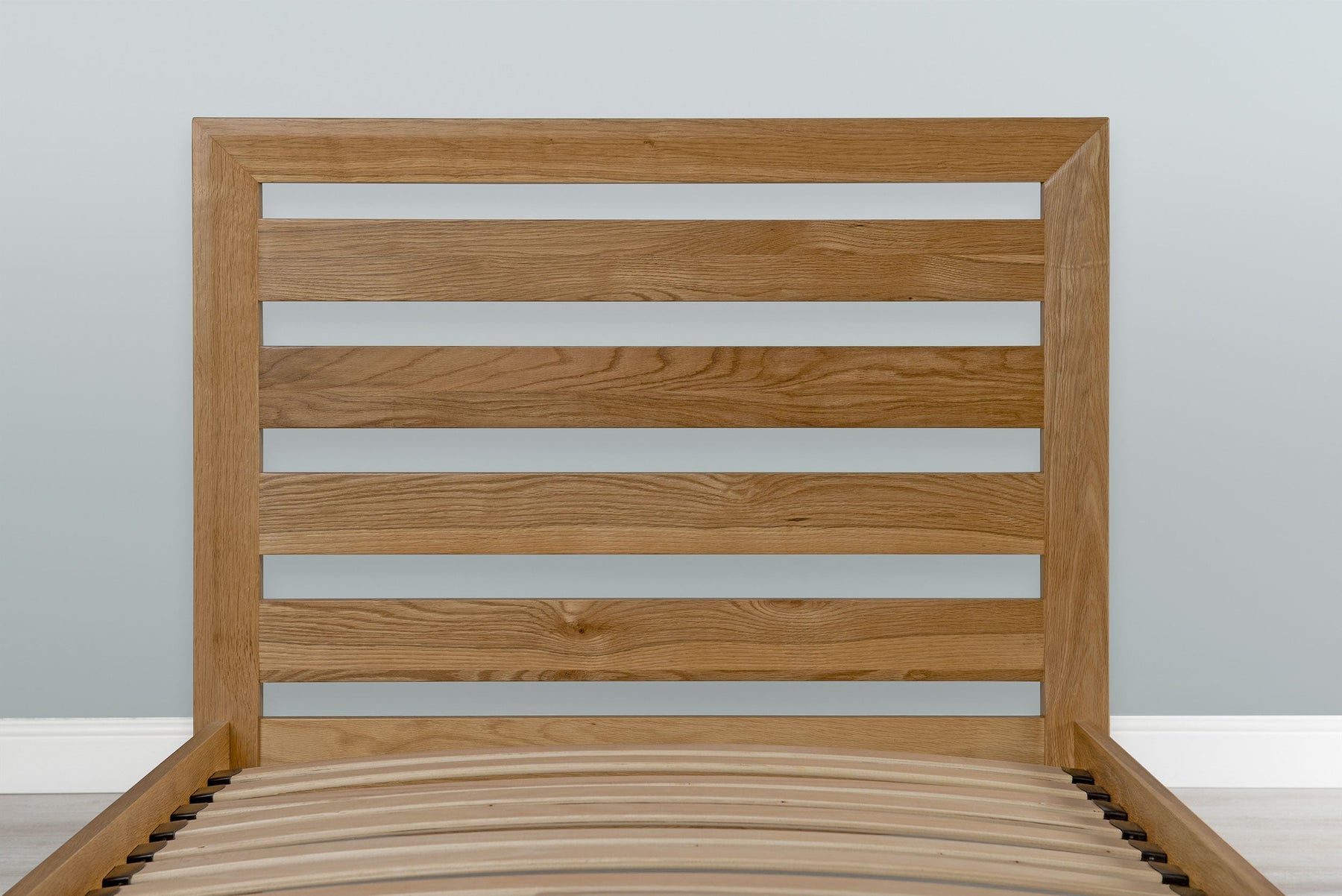 - Natural Solid Oak Bed Frame with a slatted headboard and low footboard design