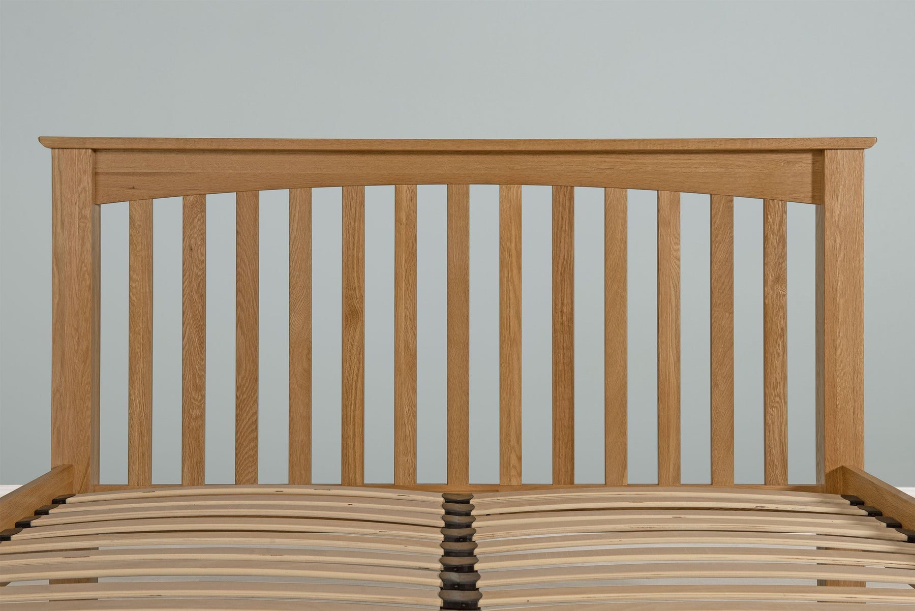- Natural Oak Bed Frame with a slatted headboard and footboard