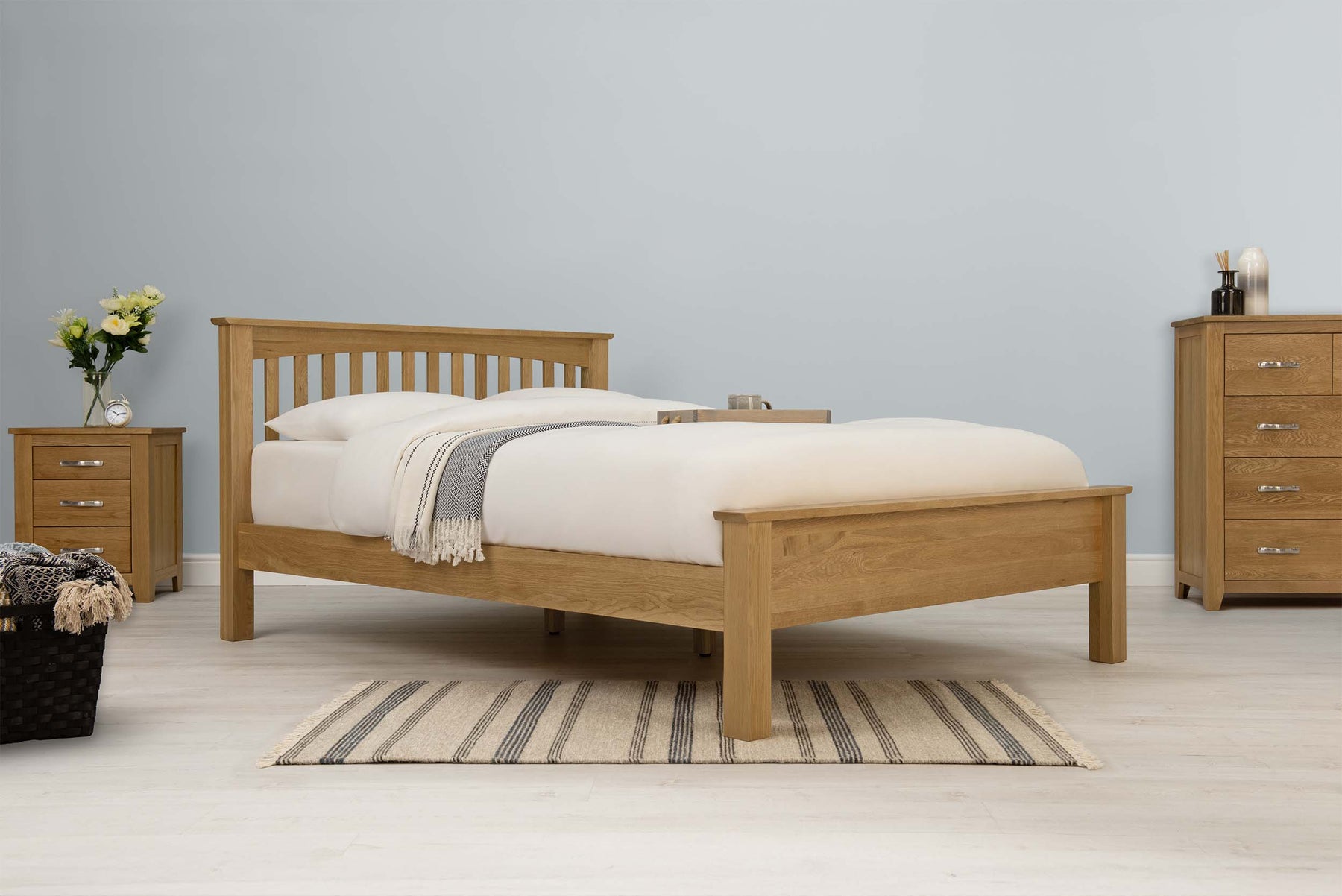 • Natural Oak Bed Frame with a slatted headboard and a low solid footboard