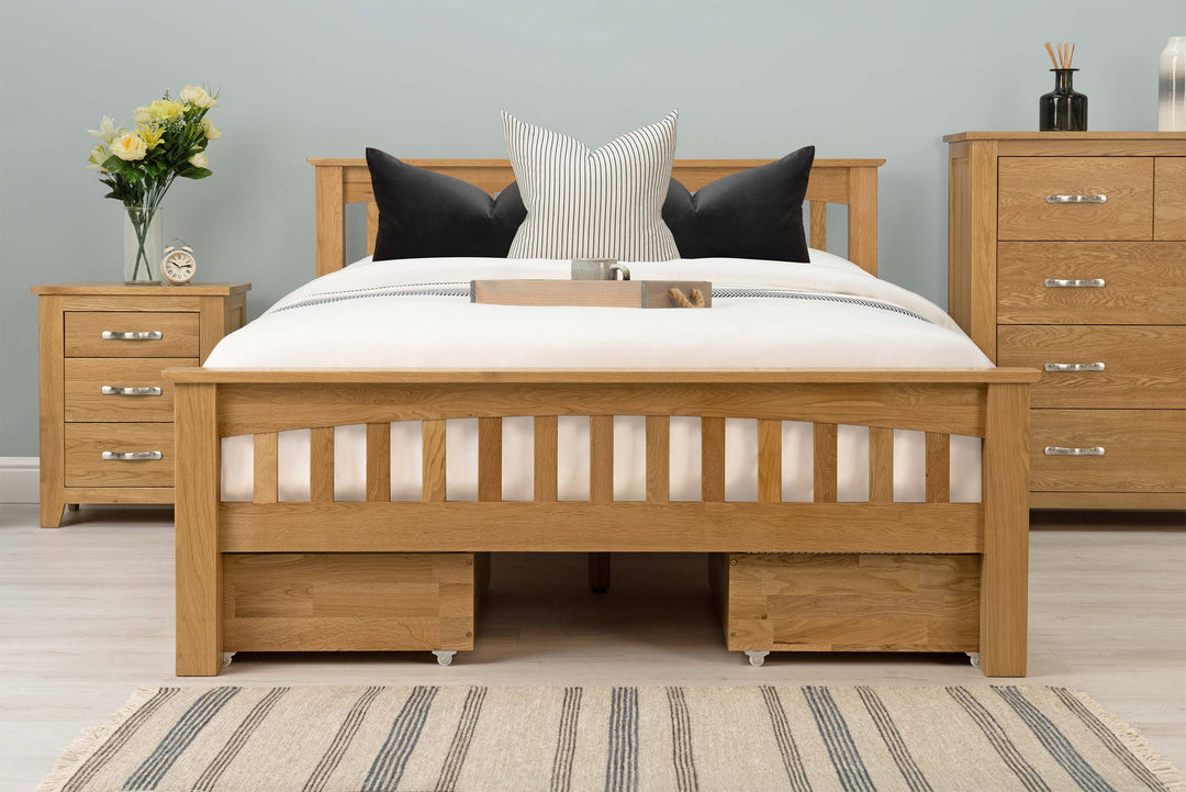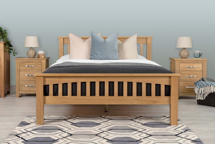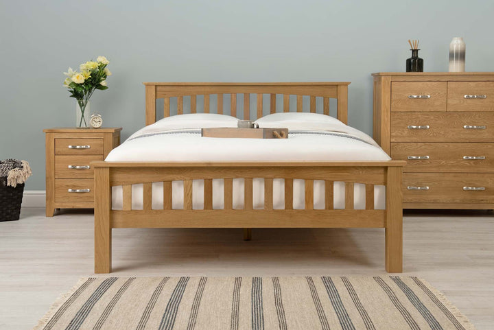 - Natural Oak Bed Frame with a slatted headboard and footboard