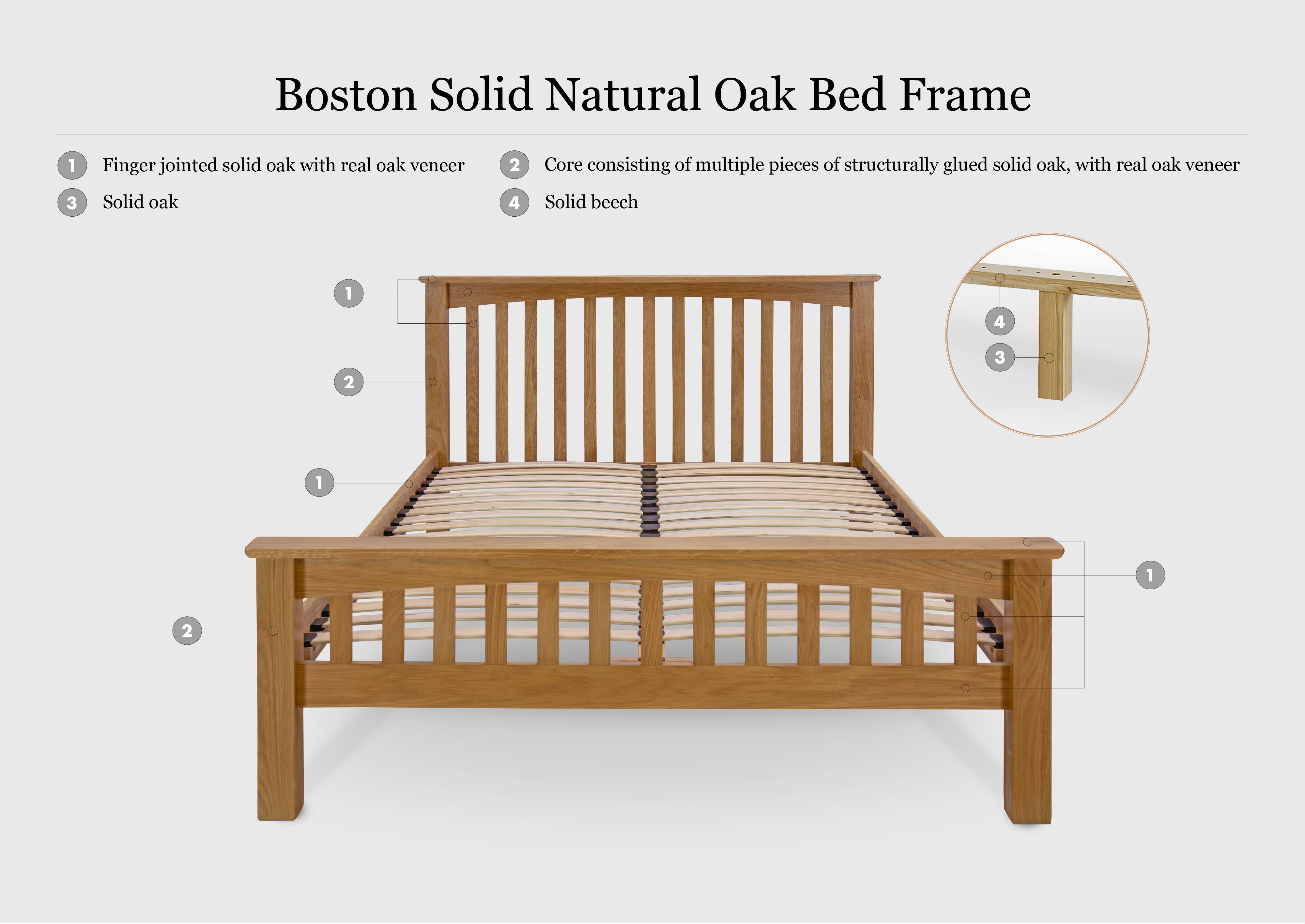 Now Available Without VeneerThe Boston Solid Natural Oak Bed Frame is now available without veneer. This option is crafted using Solid Oak with no veneer, and protected with the same lightweight clear lacquer that beautifully enhances the natural oak grain. |