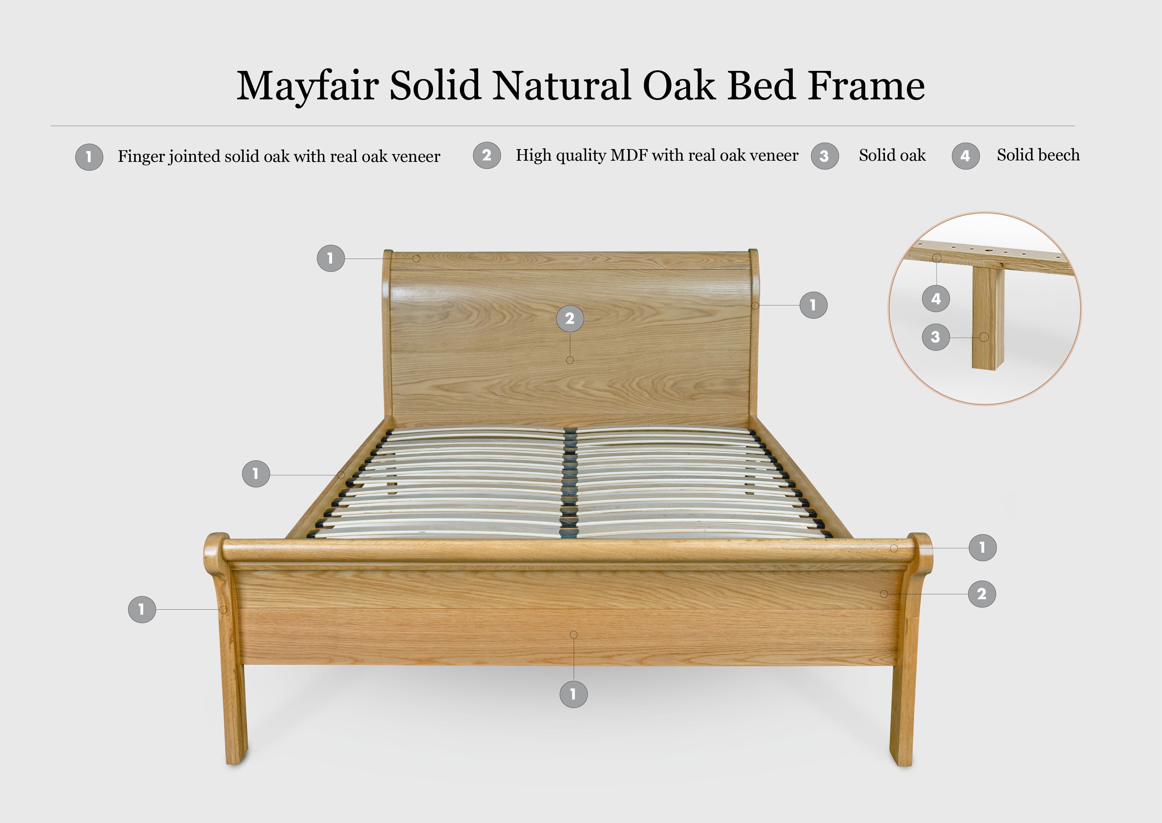 With a frame crafted from American White Oak & High Quality Real Oak Veneer, this bed is sturdy and durable. The central inset panel of the headboard and footboard are made from MDF (for structural integrity purposes). The Mayfair Natural Oak Bed Frame is also finished with a lightweight clear lacquer to enhance the natural grain of the oak and protect it throughout its lifetime.