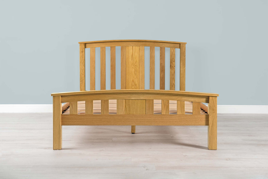 • Natural Solid Oak Bed Frame with a slatted headboard and footboard