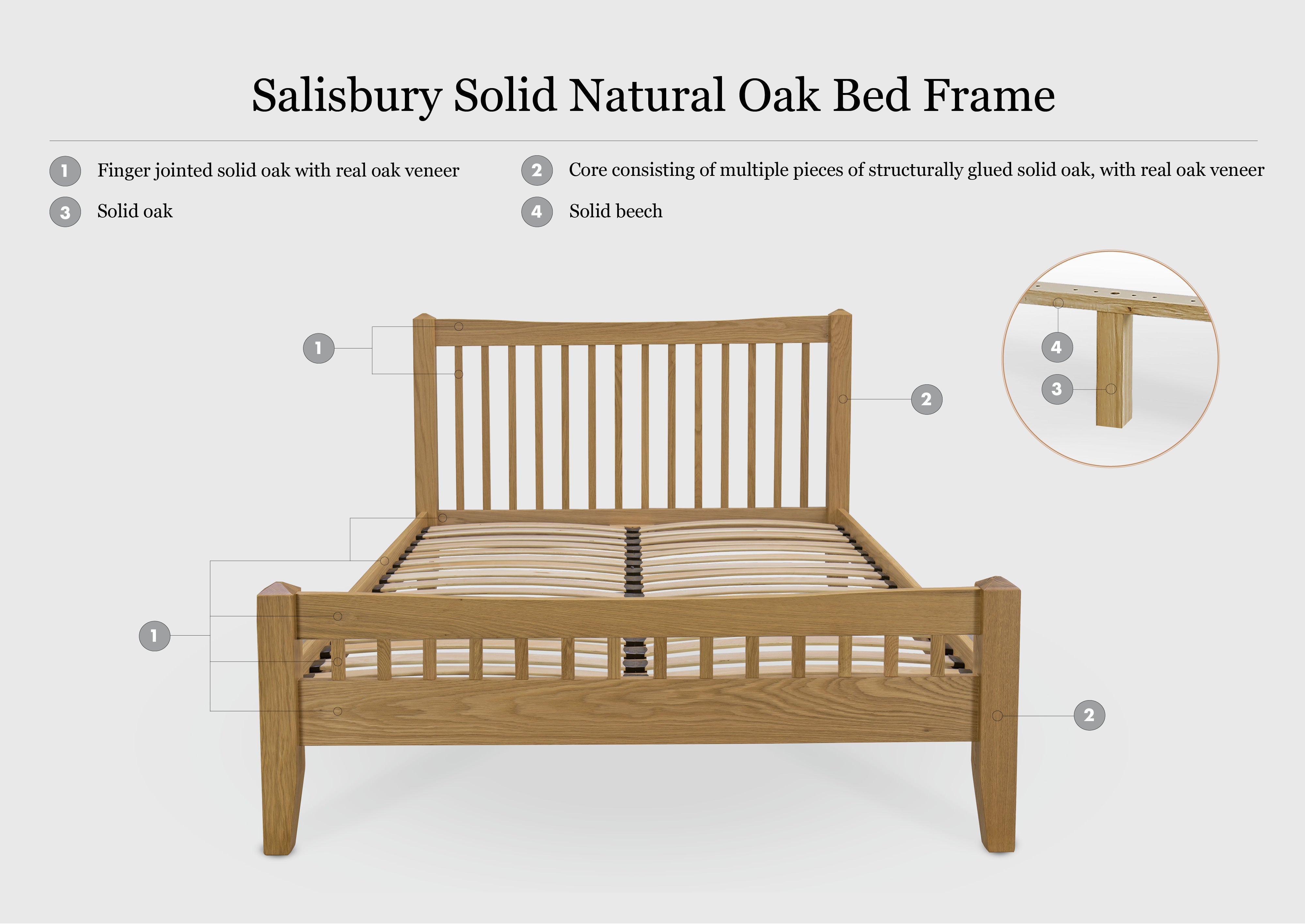 Crafted from American White Oak & High Quality Real Oak Veneer protected with a light, clear lacquer to enhance the natural grain. The Salisbury Natural Oak Bed Frame will remain sturdy and in-style for years to come. This design is classic and versatile, and will perfectly complement any bedroom.