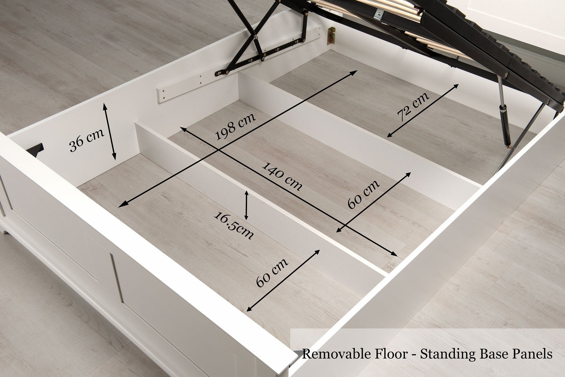 The base of the storage area consists of 4 removable MDF panels topped with a PU veneer. These panels are optional and designed to protect your flooring. They also provide ease of access and cleaning of the under-bed storage area. These panels are simply placed on top of your floor and are not fixed in position, as a result there is no weight limit for the items that you can store underneath your bed frame.