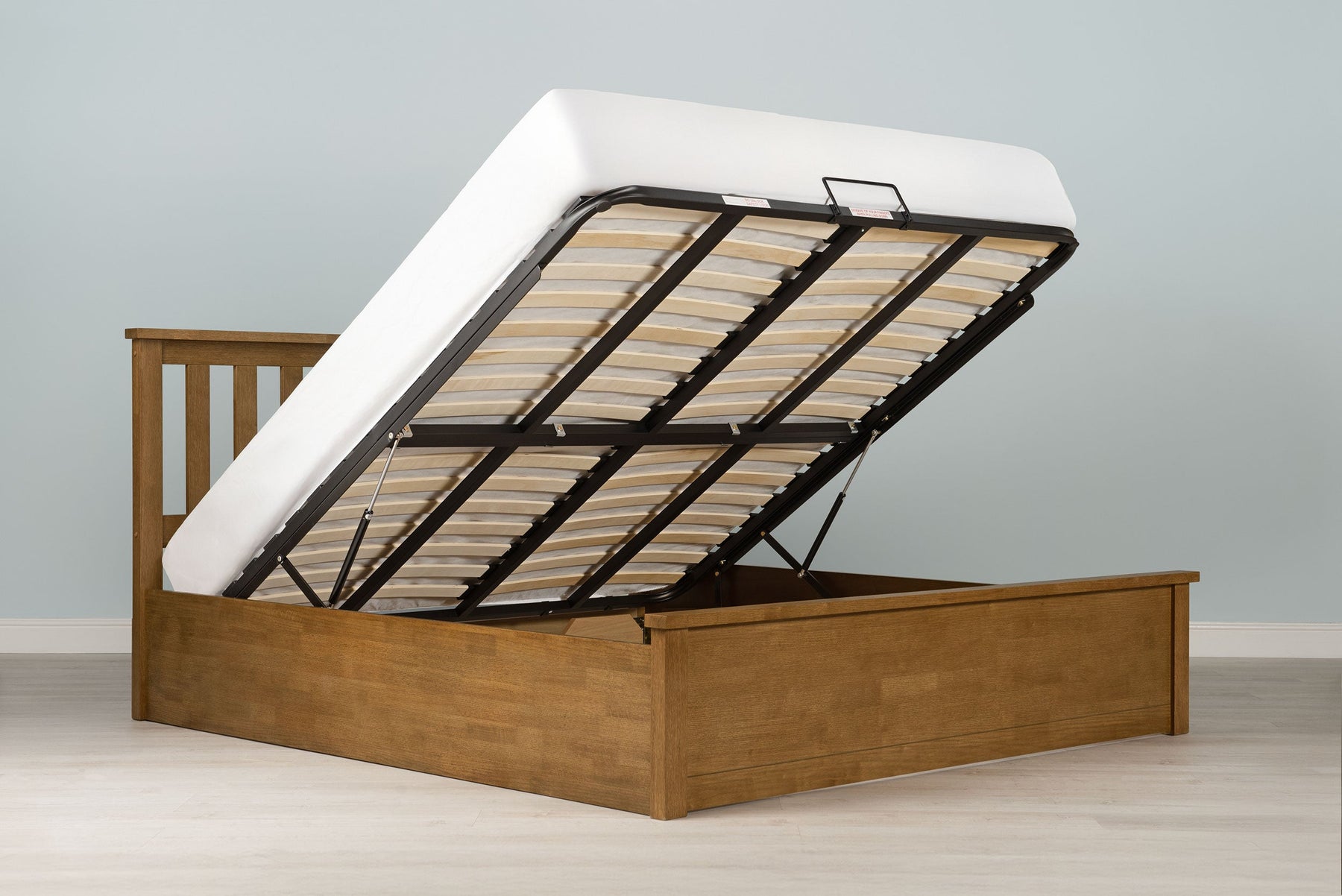 This Ottoman Storage Bed's framework (headboard and footboard posts, struts and top rails) is made from 100% Hevea. The side rails and the footboard panel are made from a high quality MDF, with a Medium Oak effect veneer applied to the bed frame.