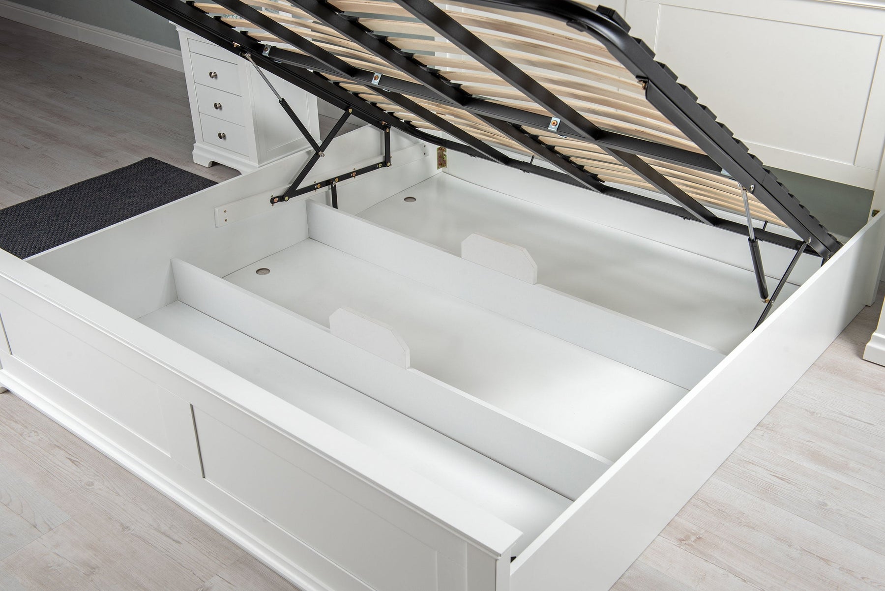 This end-lift Chilgrove Ottoman Storage Bed Frame has a Bright White painted finish, and is the perfect choice to increase the storage in any room without compromising on style. The elegant design of this bed frame will complement any bedroom and features a panelled headboard and footboard, corniced top rails and bracket feet.