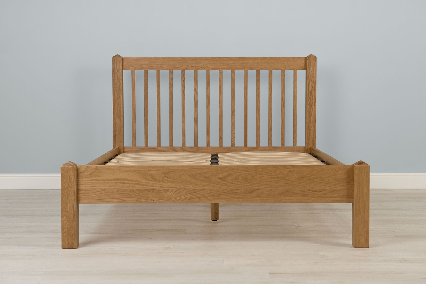 • Natural Solid Oak Bed Frame with a slatted headboard and low solid footboard