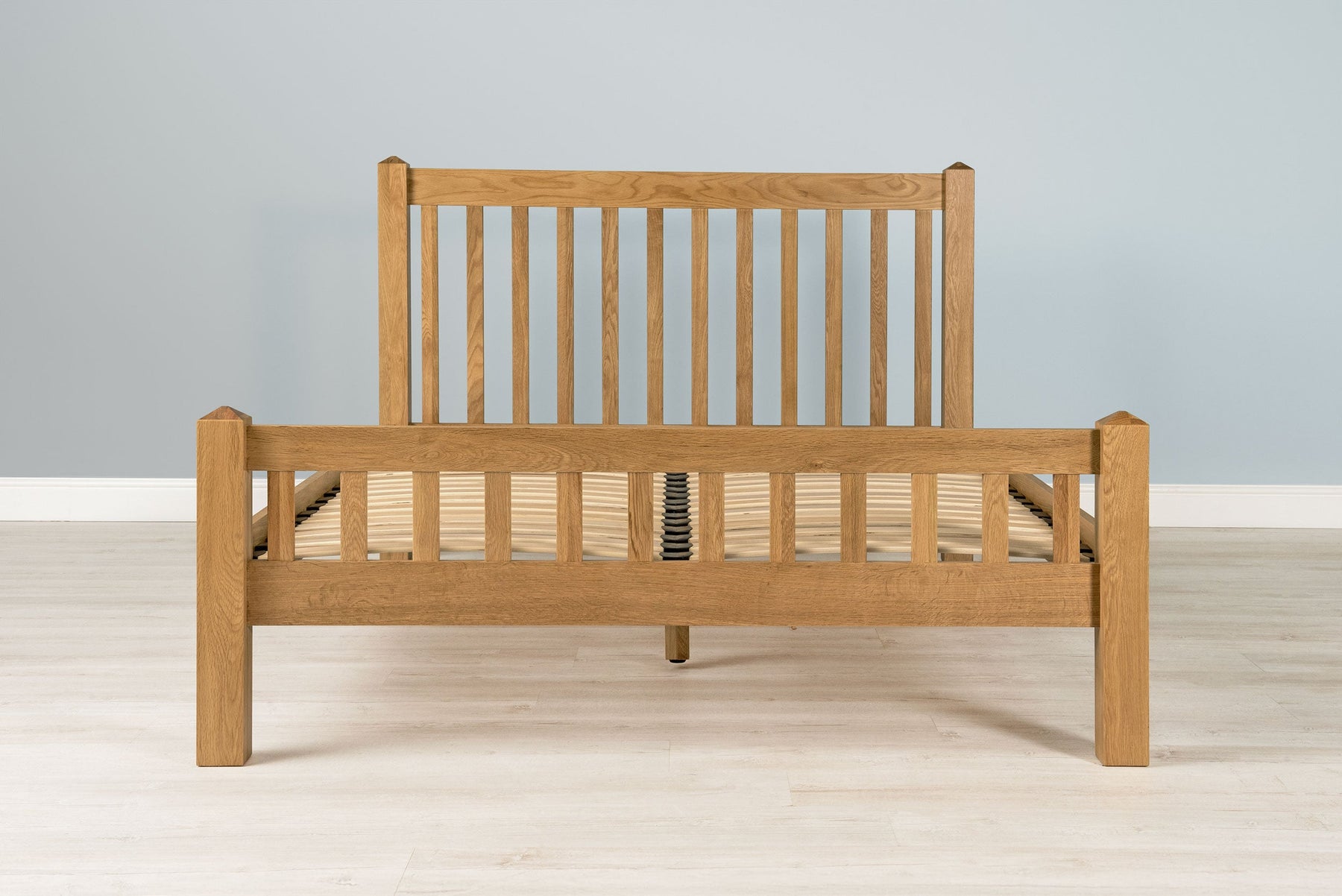• Natural Oak Bed Frame with a slatted headboard and footboard