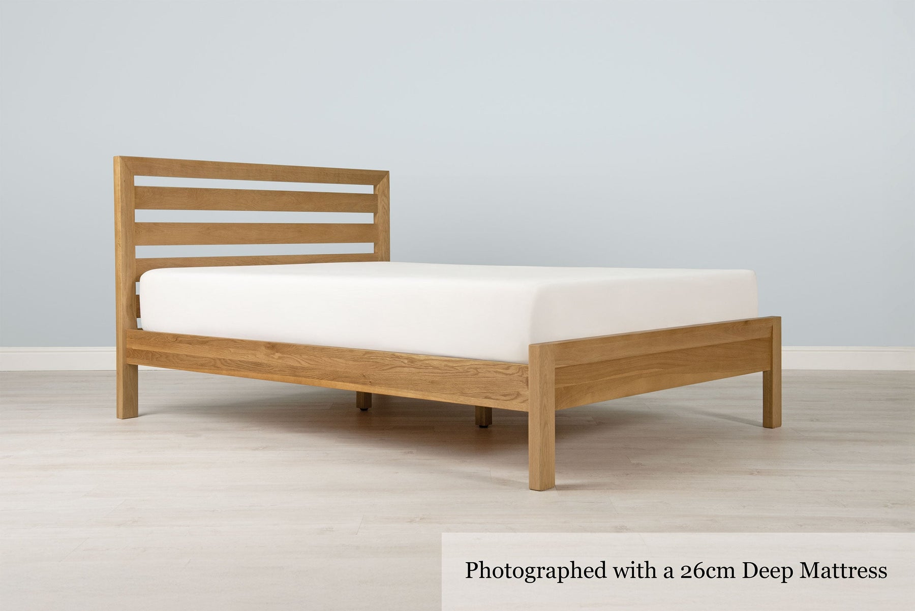 - Natural Solid Oak Bed Frame with a slatted headboard and low footboard design