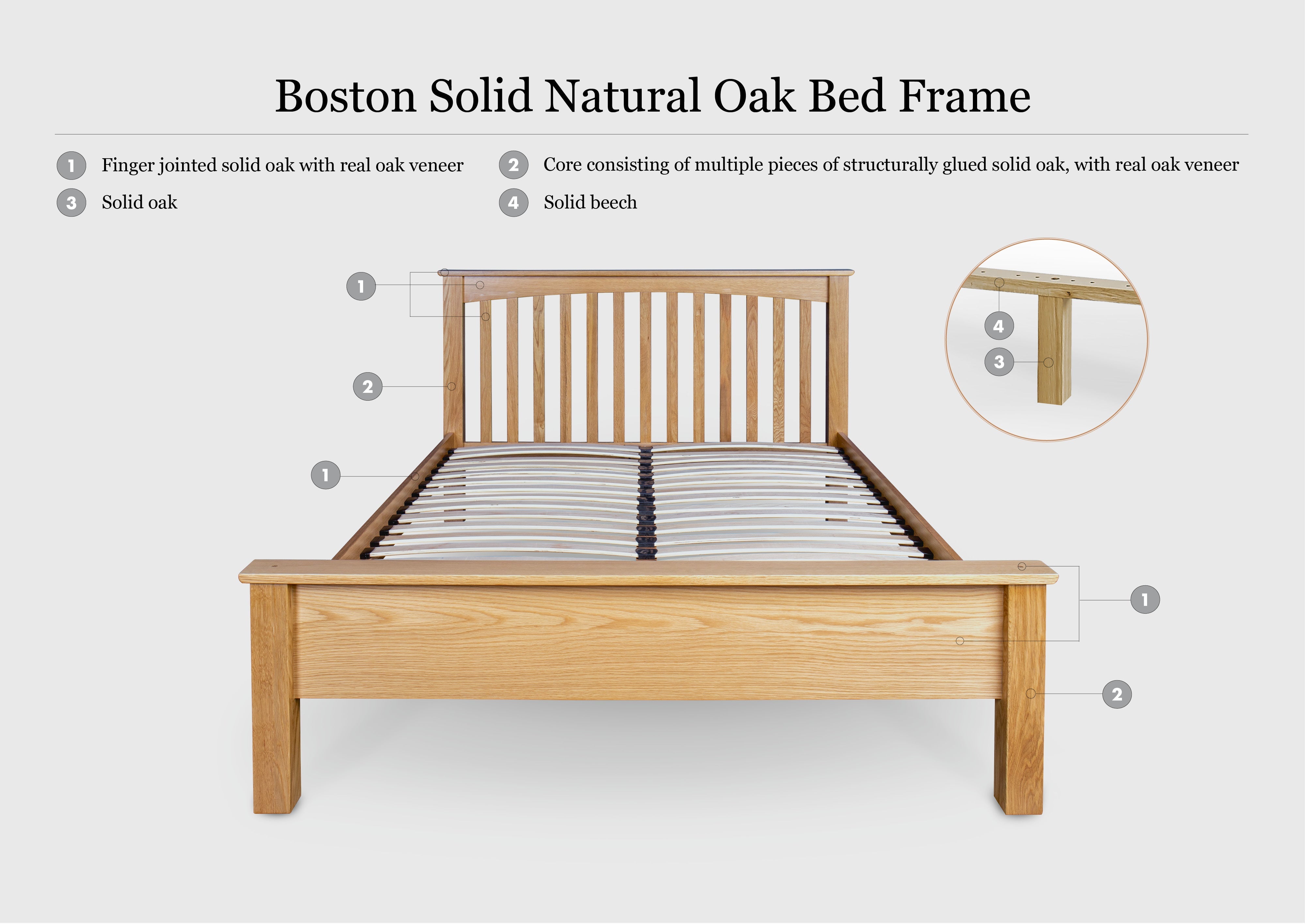 Now Available Without VeneerThe Boston Solid Natural Oak Bed Frame is now available without veneer. This option is crafted using Solid Oak with no veneer, and protected with the same lightweight clear lacquer that beautifully enhances the natural oak grain. |