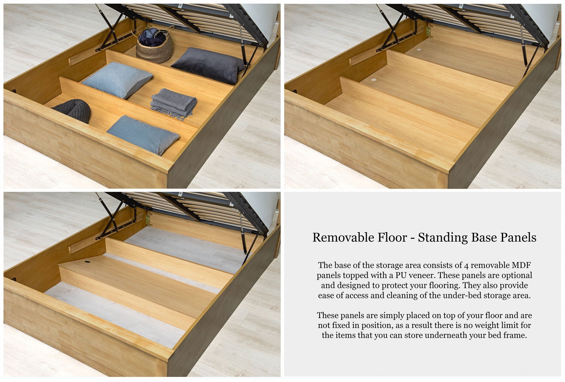 The base of the storage area consists of 4 removable MDF panels topped with a PU veneer. These panels are optional and designed to protect your flooring. They also provide ease of access and cleaning of the under-bed storage area. These panels are simply placed on top of your floor and are not fixed in position, as a result there is no weight limit for the items that you can store underneath your bed frame.