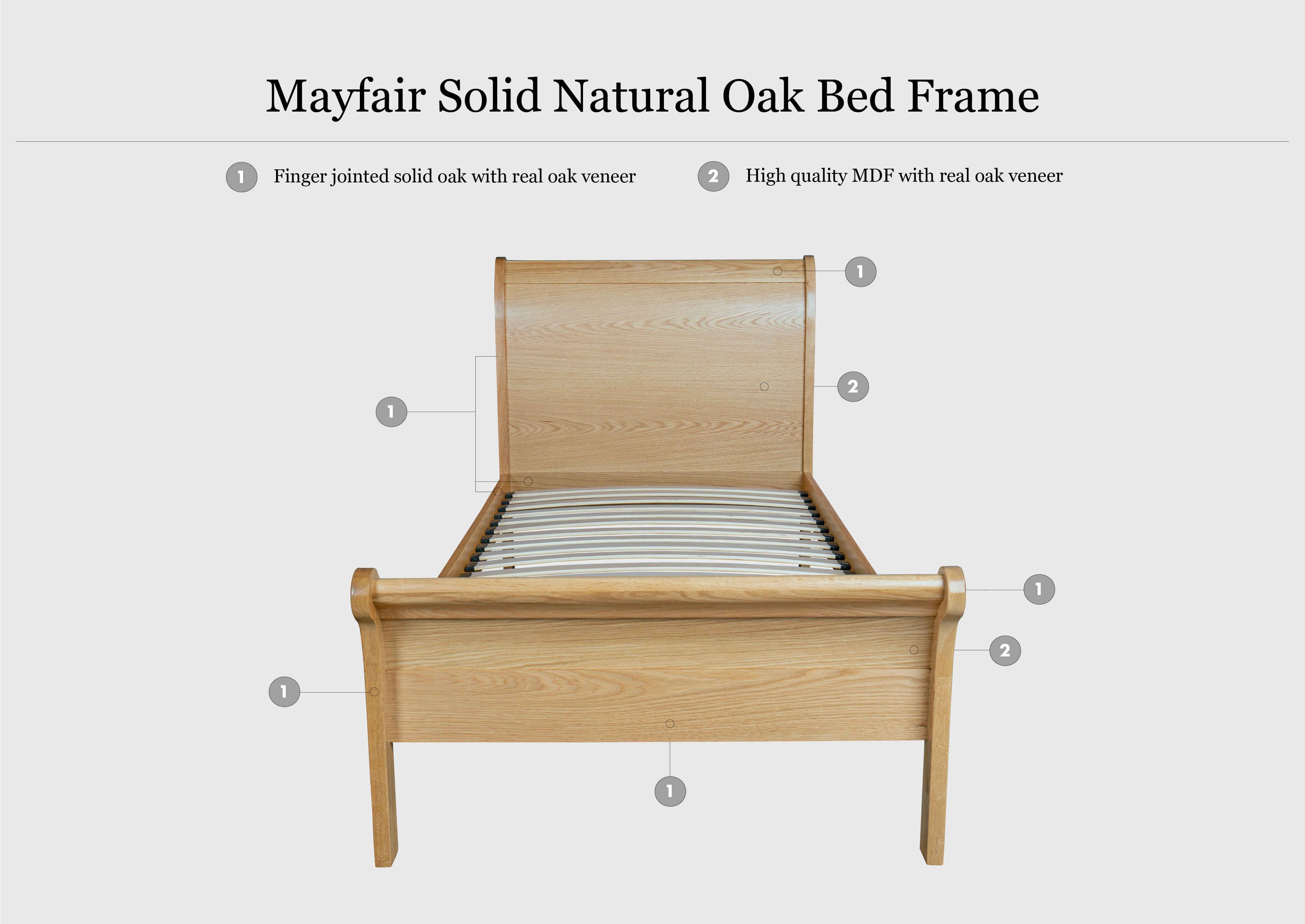 With a frame crafted from American White Oak & High Quality Real Oak Veneer, this bed is sturdy and durable. The central inset panel of the headboard and footboard are made from MDF (for structural integrity purposes). The Mayfair Natural Oak Bed Frame is also finished with a lightweight clear lacquer to enhance the natural grain of the oak and protect it throughout its lifetime.