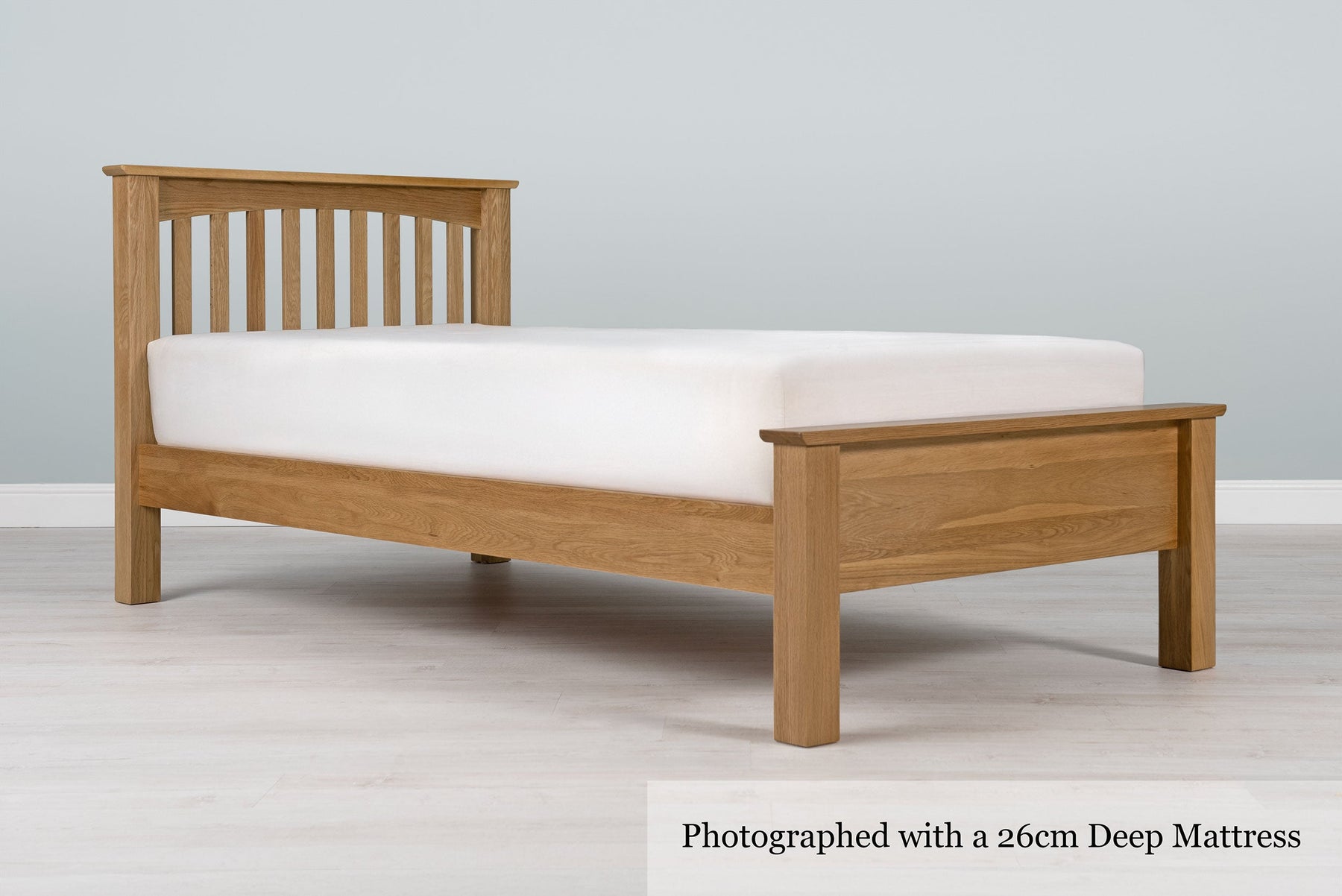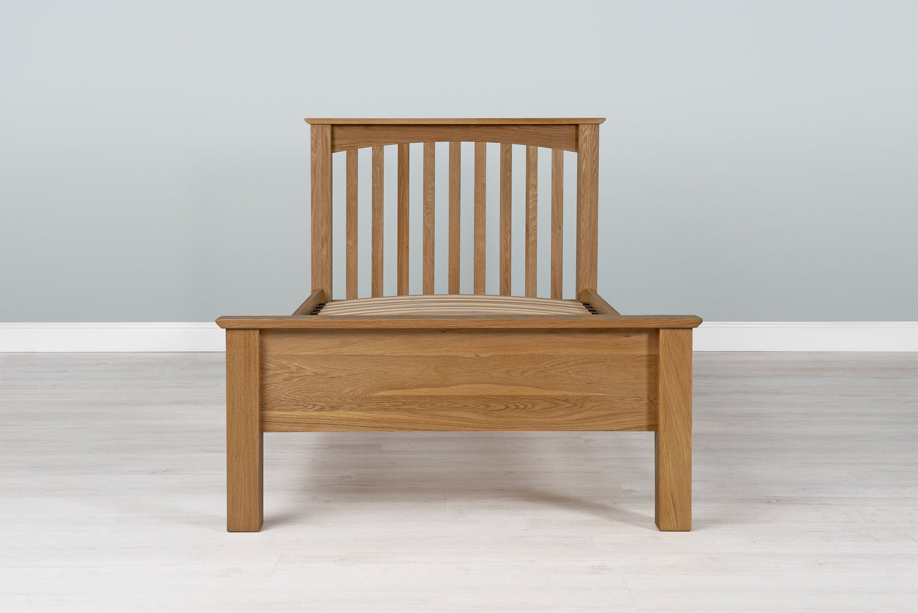 - Natural Oak Bed Frame with a slatted headboard and a low solid footboard