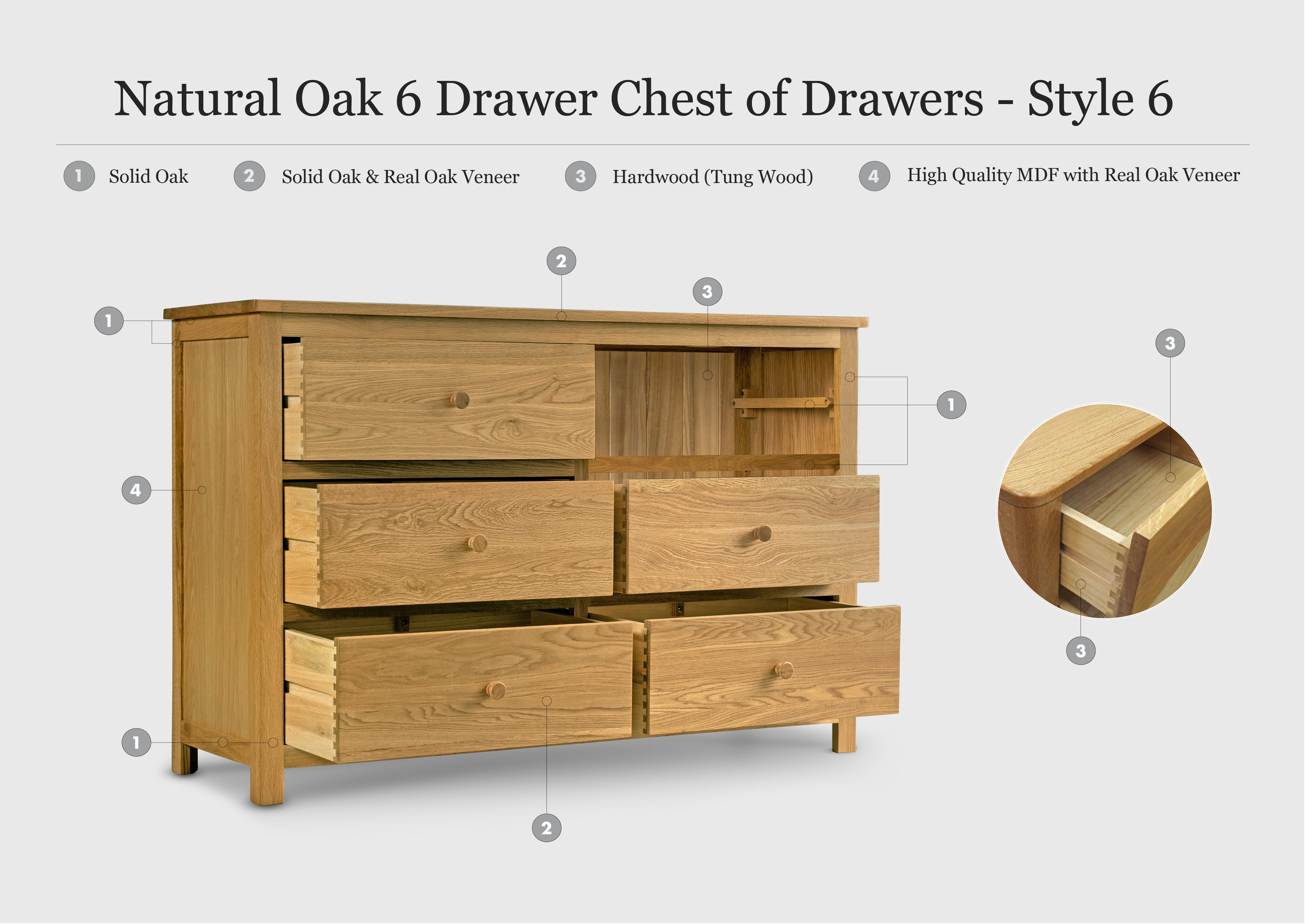 The Natural Oak 6 Drawer Chest of Drawers - Style 6 features drawers crafted with sturdy dovetail joints and hardwood bases, backs and runners for smooth, efficient use.